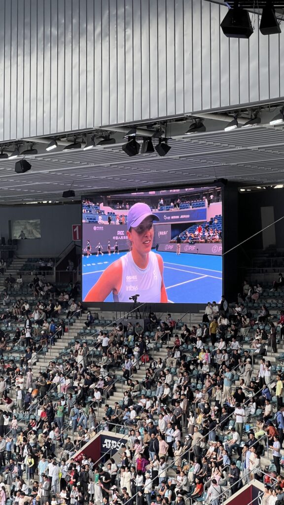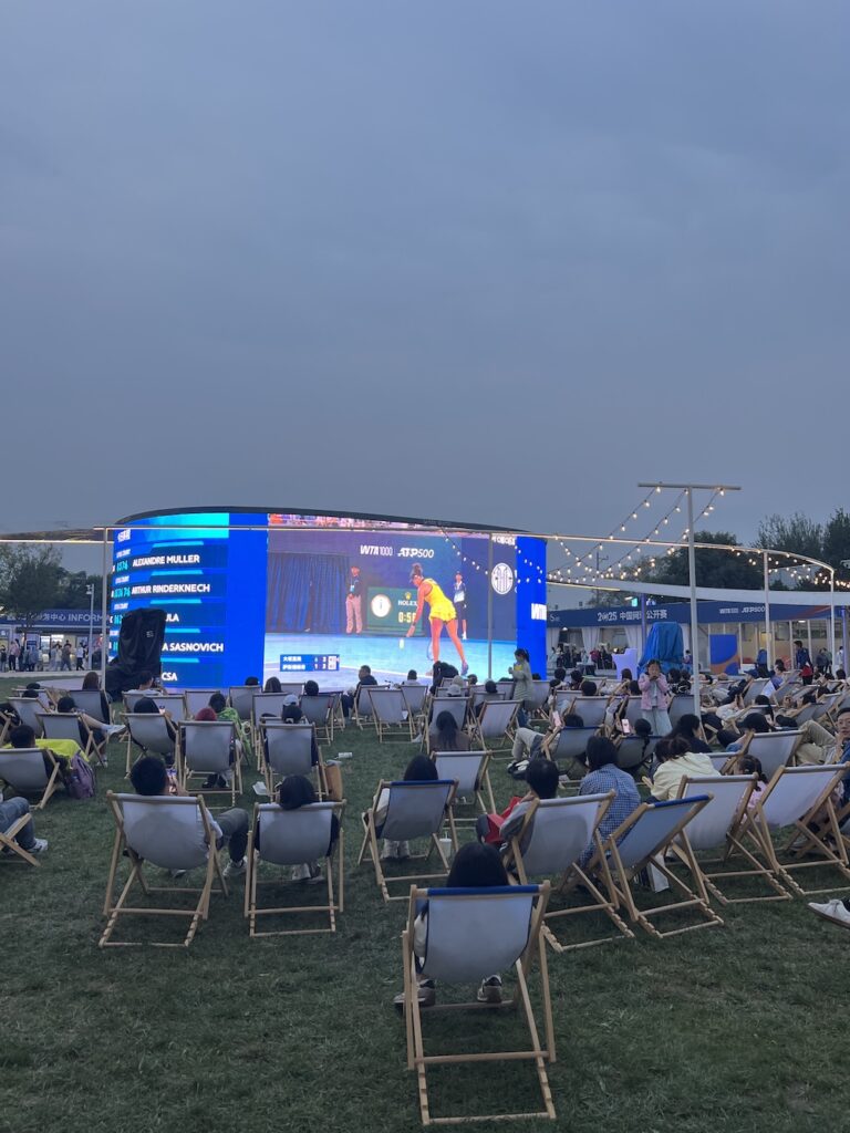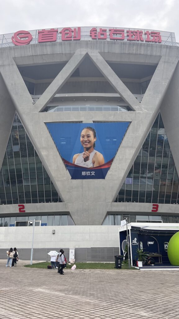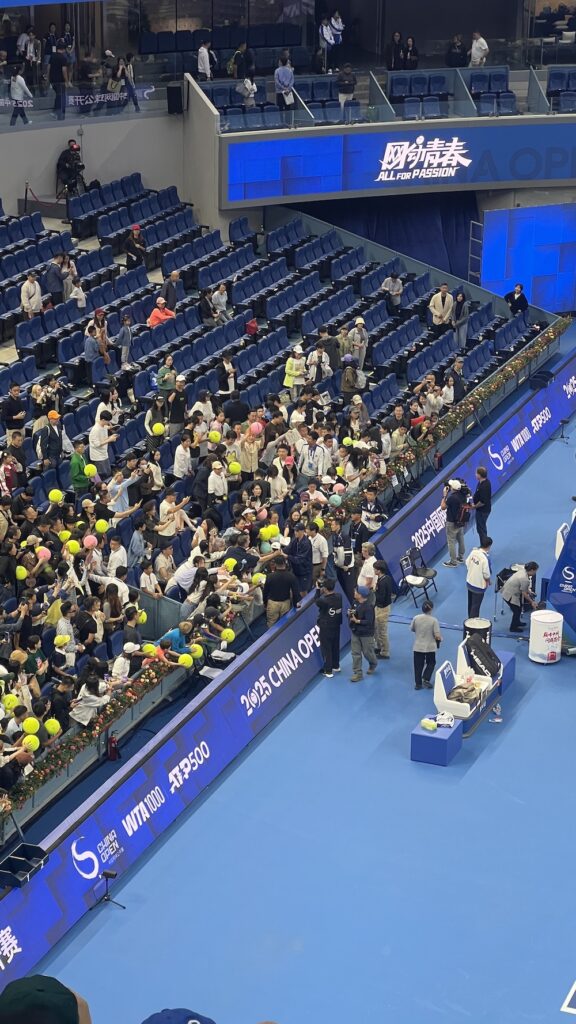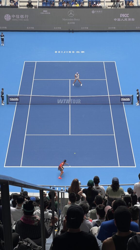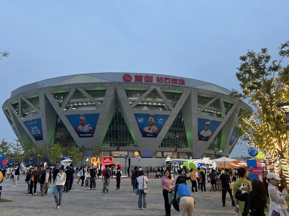 北京・オリンピック公園にある「首创钻石球場(Diamond Court)」でチャイナオープンを観戦。近未来的な建物に並ぶ巨大な選手バナー。会場に到着しただけで、自然と胸が高鳴ります。この場所で世界トップクラスのプレーが繰り広げられるというまぎれもない事実。特別な一日の始まり。