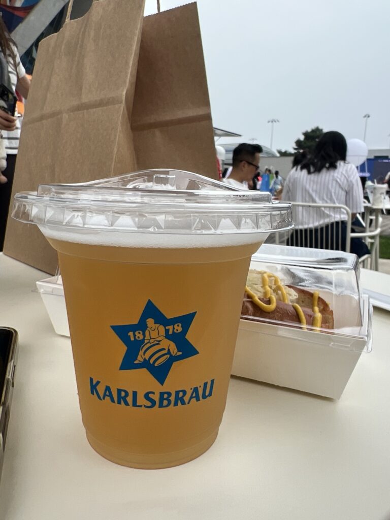ドイツビール「KARLSBRÄU」にホットドッグ、唐揚げ、パスタ、スコーンまで。お祭り気分が自然と高まります。ビールを片手に座って空を見上げていると、じわじわと観戦モードに切り替わっていく感覚がありました。